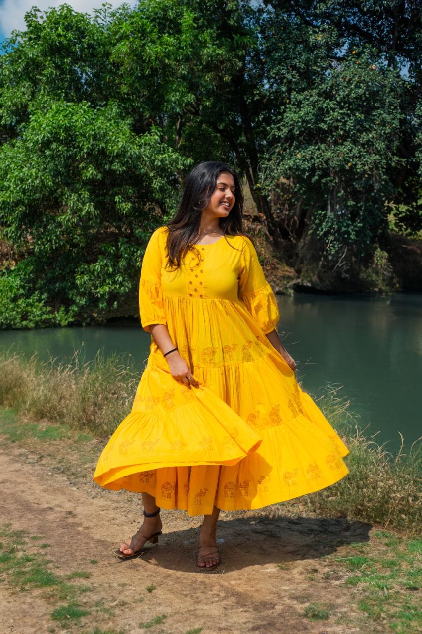 Add some zest to your wardrobe with the Aam dress! This playful, block-printed dress features...