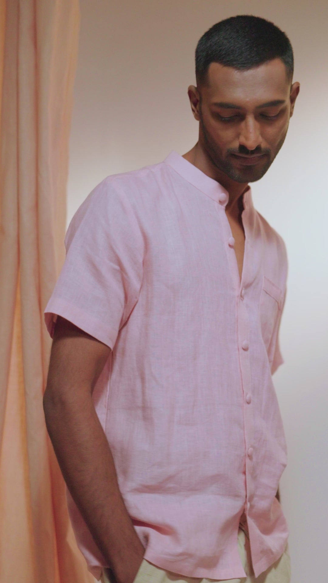 Linen Mandarin Collared Shirt Peach