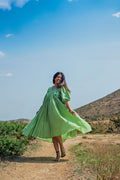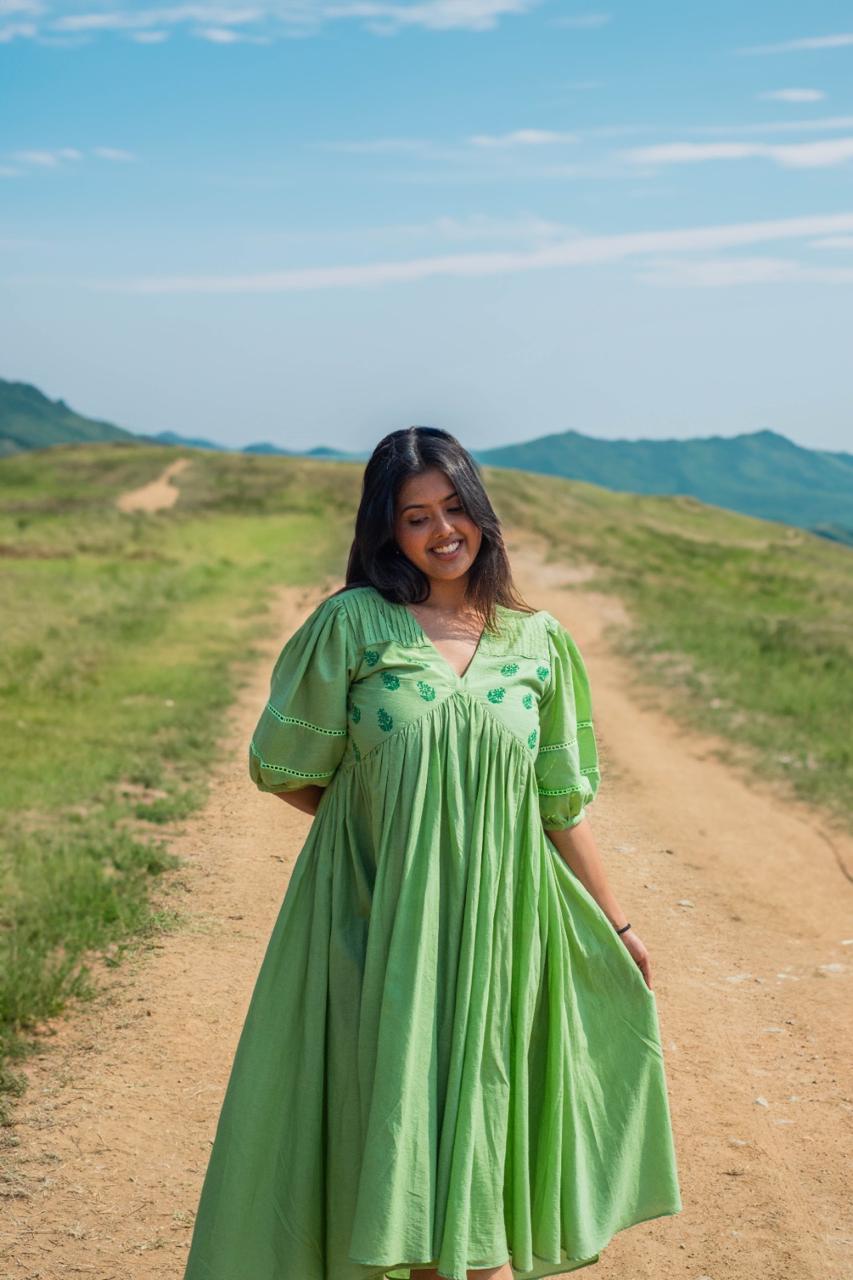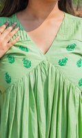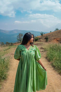 Get ready to turn heads with our Olive V-neck High-Low Dress! Made with soft, breathable Mul Cotton, this dress features a stunning olive green colour, a flattering V-neck, and unique details like yoke gathers, pintucks, and a beautiful block print. The lace detailing on the sleeves adds a touch of elegance. Stand out from the crowd in this one-of-a-kind dress.